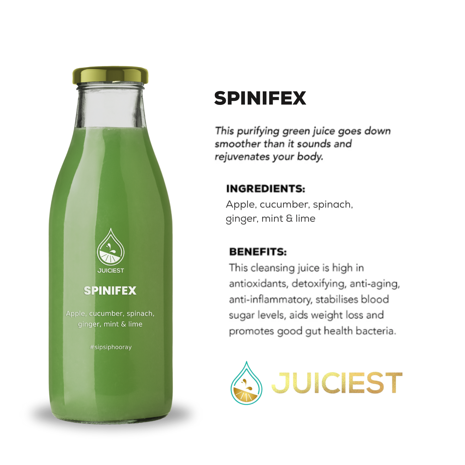 Apple, cucumber, spinach, lime, ginger and mint.